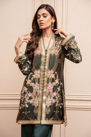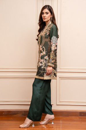 Make a majestic statement with our digitally printed emerald green shirt! This stunning front-open design exudes regal elegance, perfectly complemented by intricate tilla outlines. Paired with a matching pant for a cohesive and sophisticated look, this ensemble is sure to turn heads.