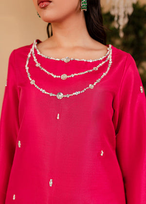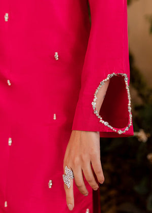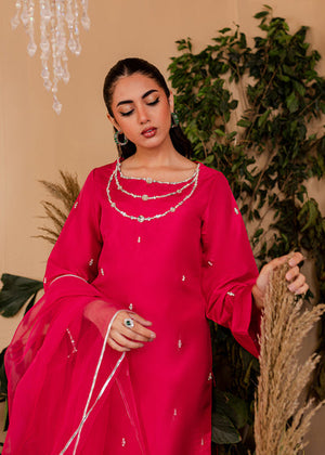 Ela exhibits exquisite artistry. An enchanting figure swathed in the ethereal hue of Hot pink, adorned with a mesmerizing ensemble that boasts a palette of silver tones, casting an aura of sheer luxury. These intricate adornments find their perfect complement in an airy Organnza dupatta. Paired with flared pants to complete the look.