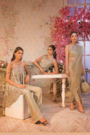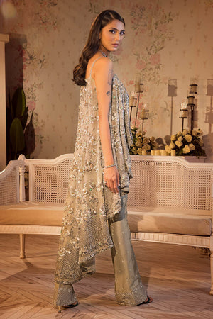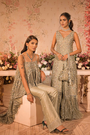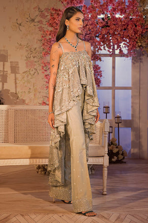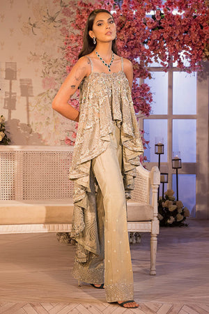 An amalgamation of bold cuts, embroideries and textures that defines a unique bridal style. Presenting to you our mint green high low shirt with spaghetti straps. With intricate handwork of sequins and crystals all over the shirt paired with plazzos that has a thick border with boti spray above the borders.