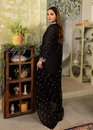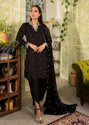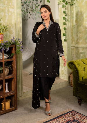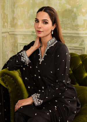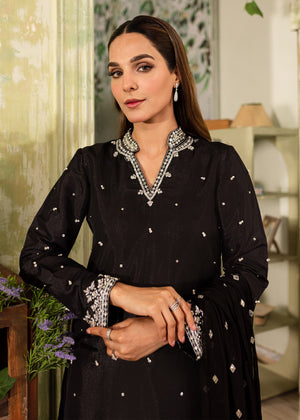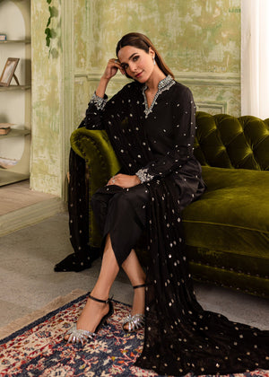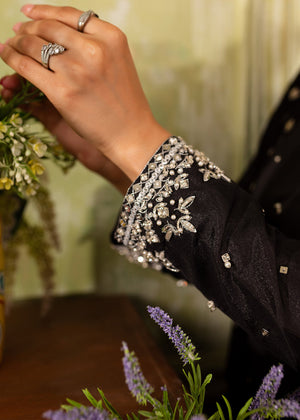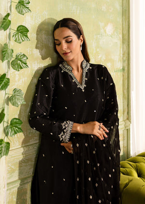 Elana brings a touch of sophistication to your wardrobe with this exquisite hand embellishment details. This stunning ensemble is completed with a pair of tulip pants and chiffon dupatta with geometric details in tilla work.