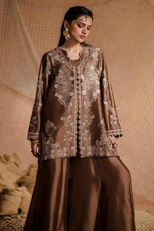 A short, front-open sheesha silk jacket paired with flared pants and a matching bandeau. Detailed with floral khaddi silk appliqué and cutwork for a textural finish.