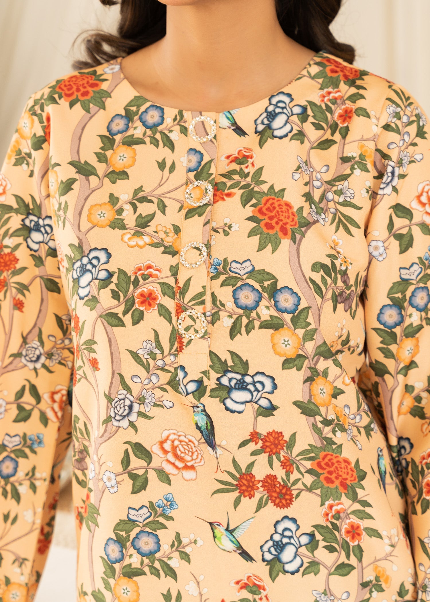 An endearing yellow matching separate set covered in a beautiful floral print, paired with printed organza dupatta making sure you stand out with poise and beauty.