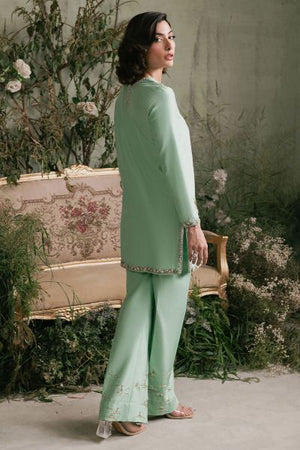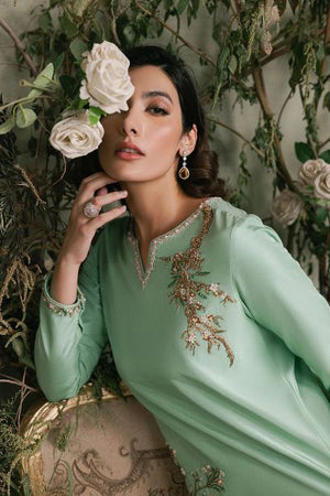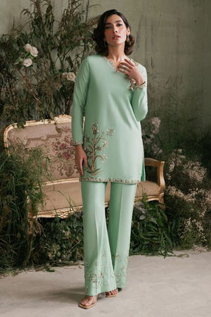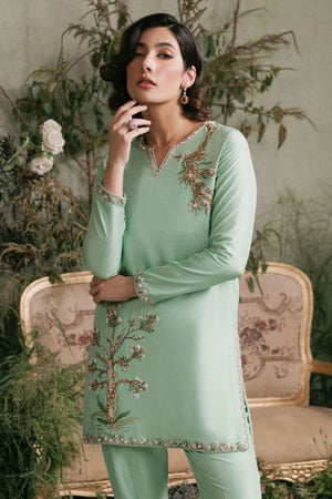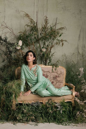 Embody nature's elegance with this captivating apple green Elara shirt, featuring an exquisite tree embellishment on one side. The V-neckline is adorned with delicate pink and white pearls, complemented by a striking tree motif. Paired with a sleek boot-cut trouser, embellished with luminous pearls, this ensemble exudes refined sophistication. Perfect for formal events, weddings, or cultural celebrations, this outfit showcases exceptional craftsmanship and attention to detail.