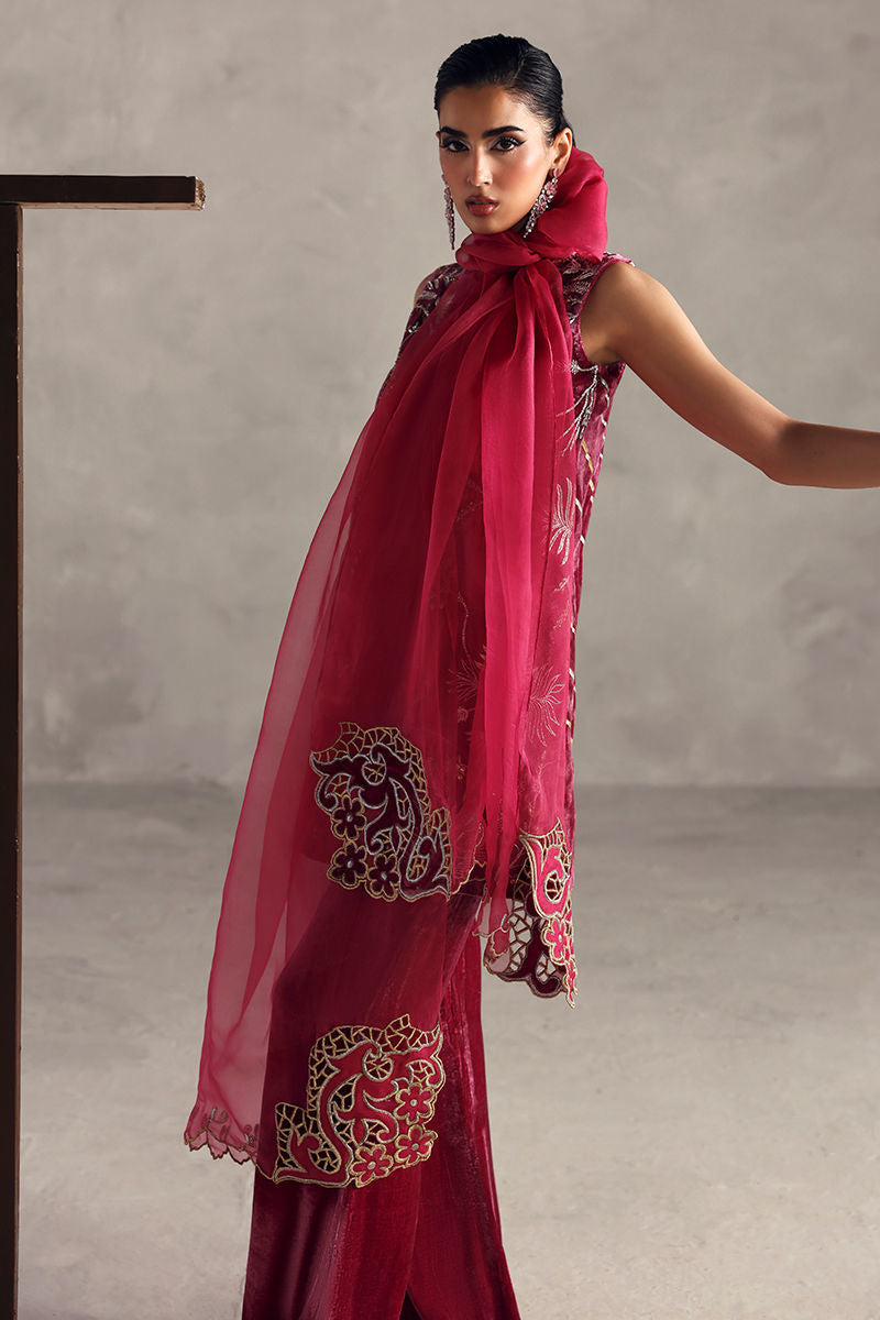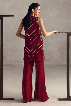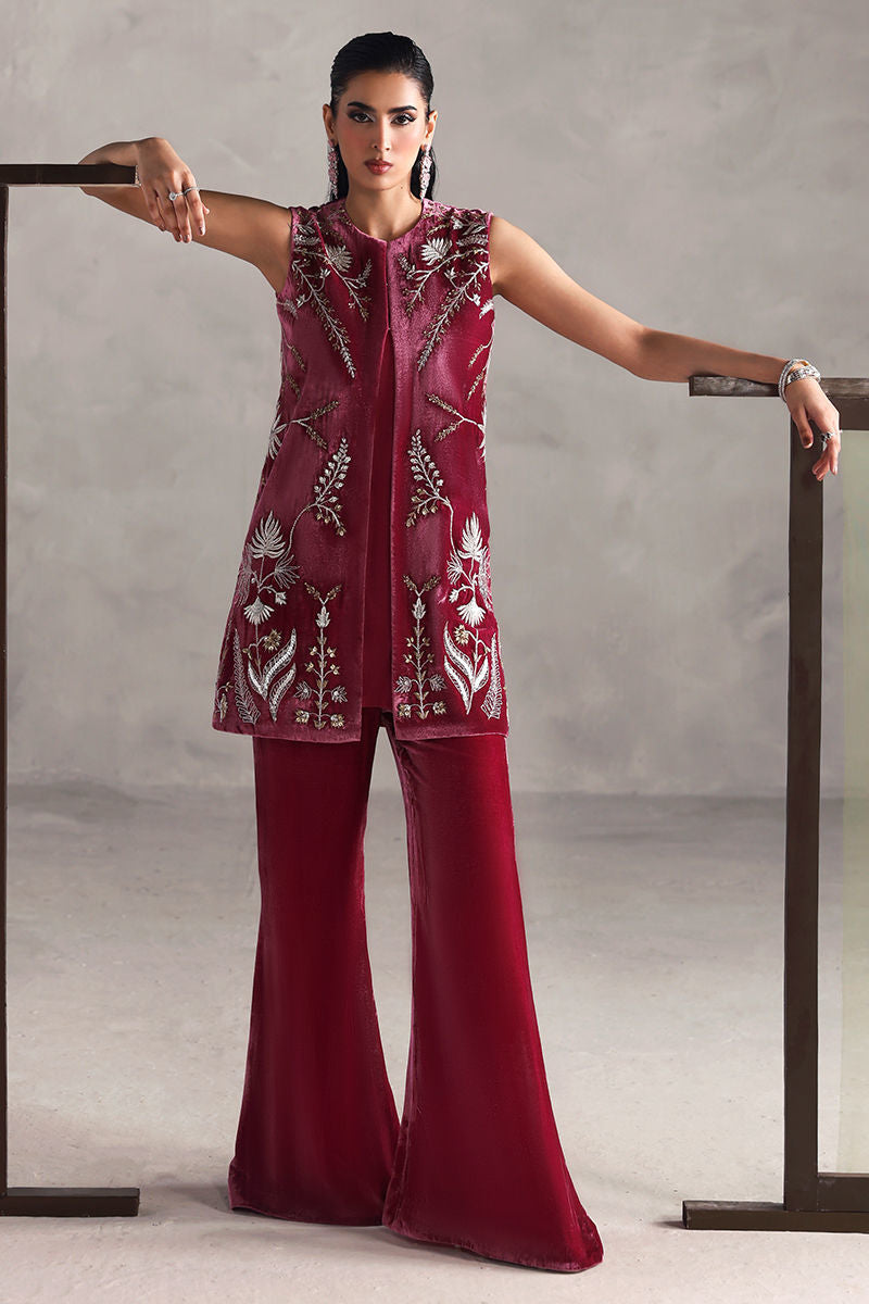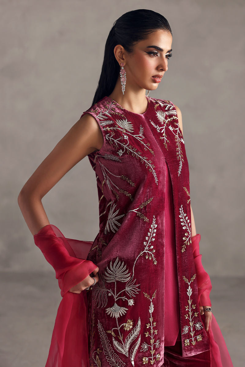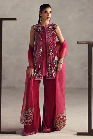 A luxurious pink ensemble featuring a pure velvet shirt and matching pure velvet palazzo, radiating opulence and charm. The look is beautifully completed with a pure organza dupatta, adding a soft, graceful touch to the rich velvet attire.