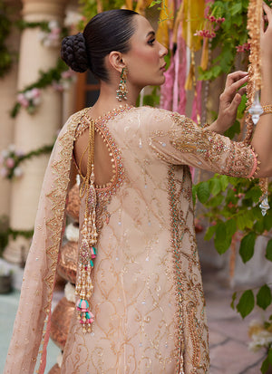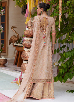 Farah Talib Aziz revisits her core strength of pastel hues, elegant embroideries and delicate modernity to create endlessly covetable designs. Cascading swathes of light gold net come together to form a flowing kalidaar, laden with meticulously hand-worked embellishments in glimmering gold and accent colors. A deliciously sheer pure net dupatta, delicately hand-embellished with a border completes the ensemble. For a subtly glamorous bride, shimmering in rose gold. This show stopping ensemble is complemented with pure silk gold jamawar izaar pants. The coordinating pure net dupatta is heavily embellished with sitara chan made from pearls and sequins. The perfect amalgamation of golds makes this absolutely must-have ensemble.