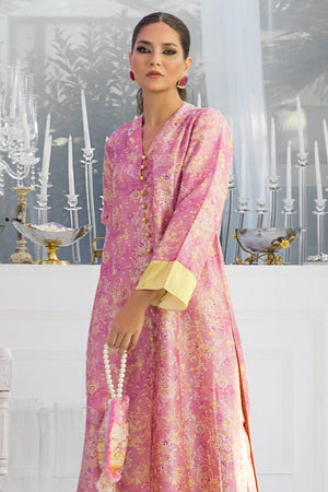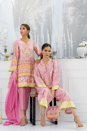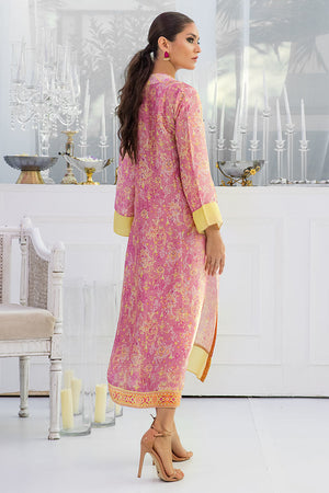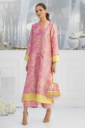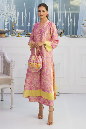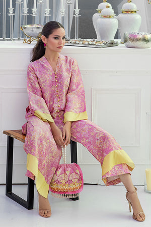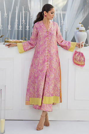 This floral digital patterned mauve straight cut button down silk shirt is a perfect fit for any daytime occasion. The outfit is finished off with a pair.