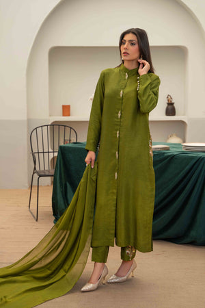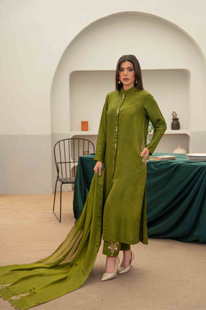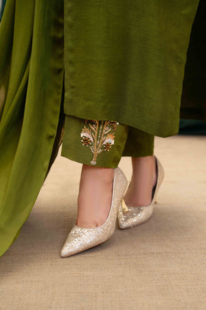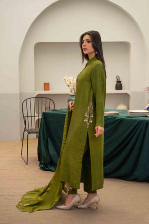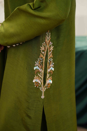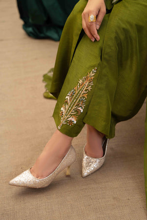 Radiance personified Elea is designer in a classic green silk which accentuates the exquisite embroidery and hand embellishments on pockets. Paired with embellished cigarette trousers and embroidered dupatta.
