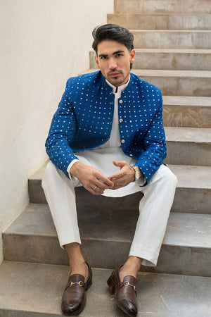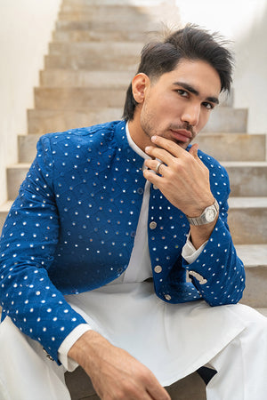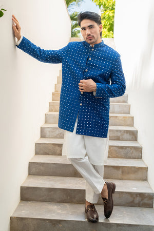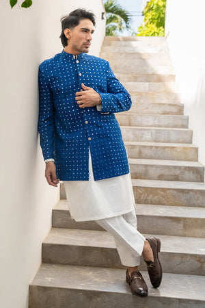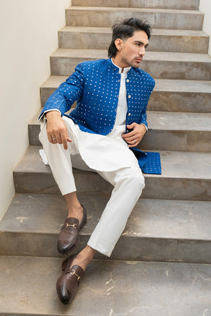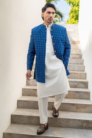 Introducing a refined ensemble featuring a prince coat crafted from embroidered raw silk, complemented by a self viscose cotton shirt and matching pants. This outfit exudes elegance and sophistication, perfect for formal occasions. The intricate embroidery on the coat adds a touch of luxury, while the soft viscose cotton ensures comfort and style.