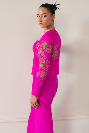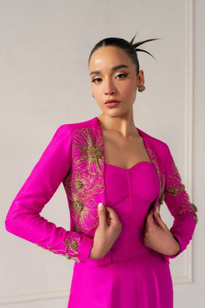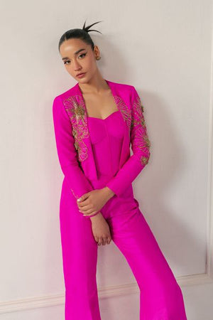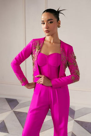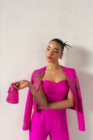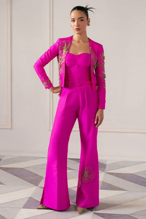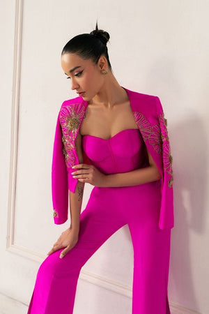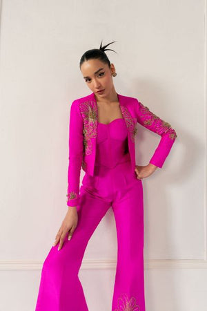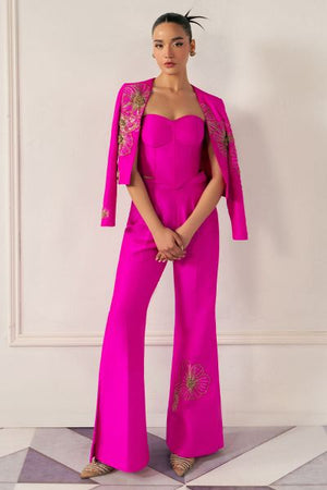 This outfit blends bold modernity with elegance. A form-fitting bustier with crystal and metallic embellishments is paired with a sharp, asymmetrical blazer. High-waisted, boot-cut pants add a flared silhouette, all with reflective accents, creating a striking, confident statement of modern power.