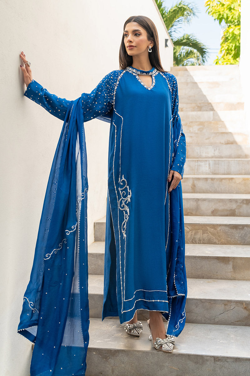Draped in electric blue, this ensemble features a pure sheesha silk shirt and tailored straight pants. Adorned with pearls, crystals, and stones, it radiates sophistication. The medium silk dupatta showcases badla embroidery, enhancing its charm. The bold halter neckline adds a contemporary edge, making it perfect for soirées and celebrations.