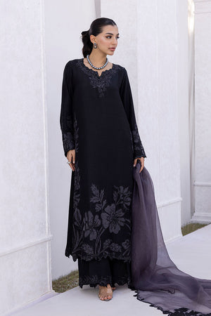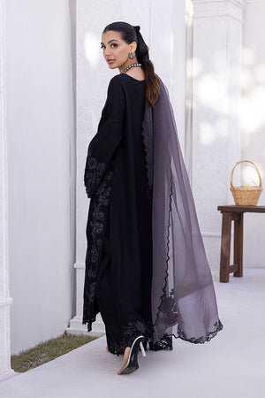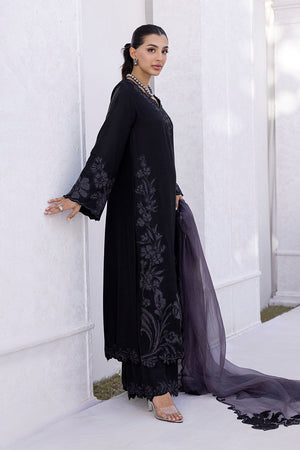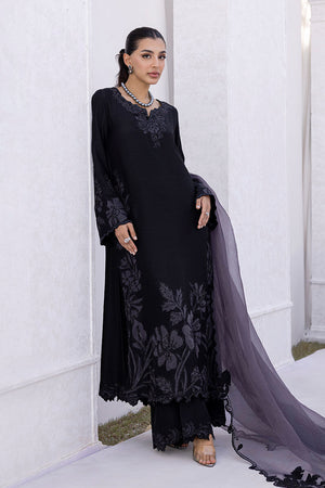 Black raw silk long kurta with a loose fit, paired with culotte pants. The kurta features a cutwork neckline and sleeve details, accented with cutdana edging for added texture. Grey appliqué floral motifs are placed across the front, creating a soft contrast against the black base. A grey organza dupatta, detailed with black appliqué work, adds dimension and completes the look.