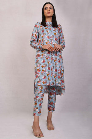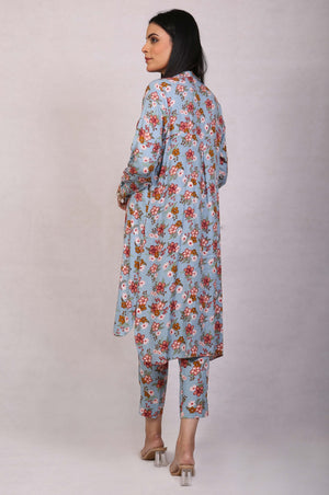 Printed two-piece chambray button down nicely stitched cuffed long shirt with capri pants.