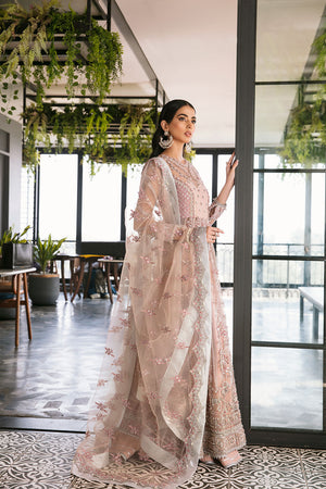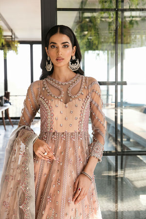 A classic kalidaar pishwas with mesmerising work of crystals and Swarovski on contemporary cut neckline, kali and hem paired with a fully embellished organza dupatta concluding it as a gleaming festive outfit.