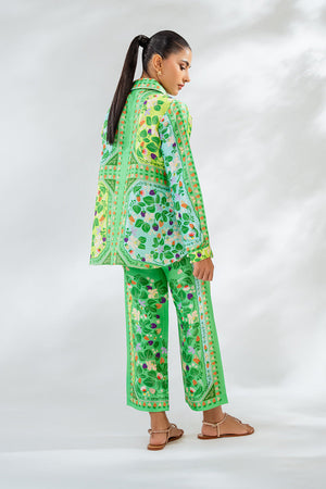 Perfect to wear from day to night, Elka (A) is a pure rawsilk co-ord set. It stands out with its cuffed sleeves and a symmetrically composed foliage print on a lime hued base with hints of vibrant green leaves and strawberries.