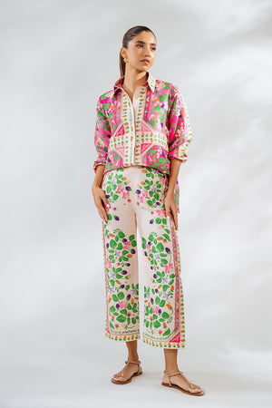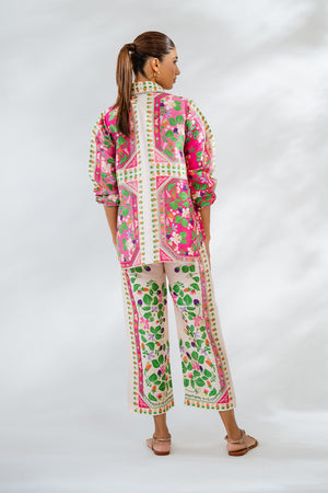 Perfect to wear from day to night, Elka B is a pure rawsilk co-ord set. It stands out with its cuffed sleeves and a symmetrically composed foliage print on a pastel hued base with hints of vibrant green leaves and strawberries.