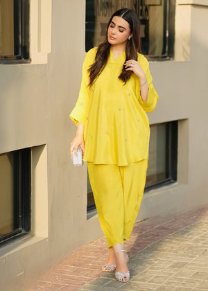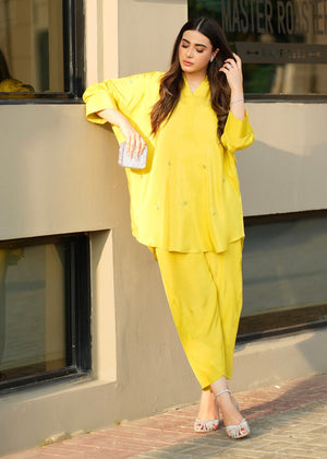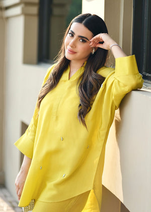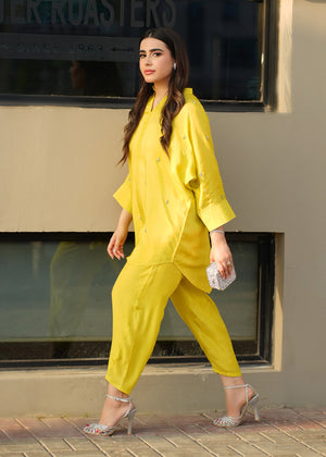 This lime yellow silk set consists of a batwing sleeve shirt and sleek shalwar.