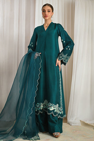 The Elodie ensemble features an emerald green raw silk long shirt with intricate embroidery and scalloped details on the hem and sleeves. Paired with matching plazo pants, the outfit is completed by a luxurious organza dupatta with delicate embroidery and cutwork.