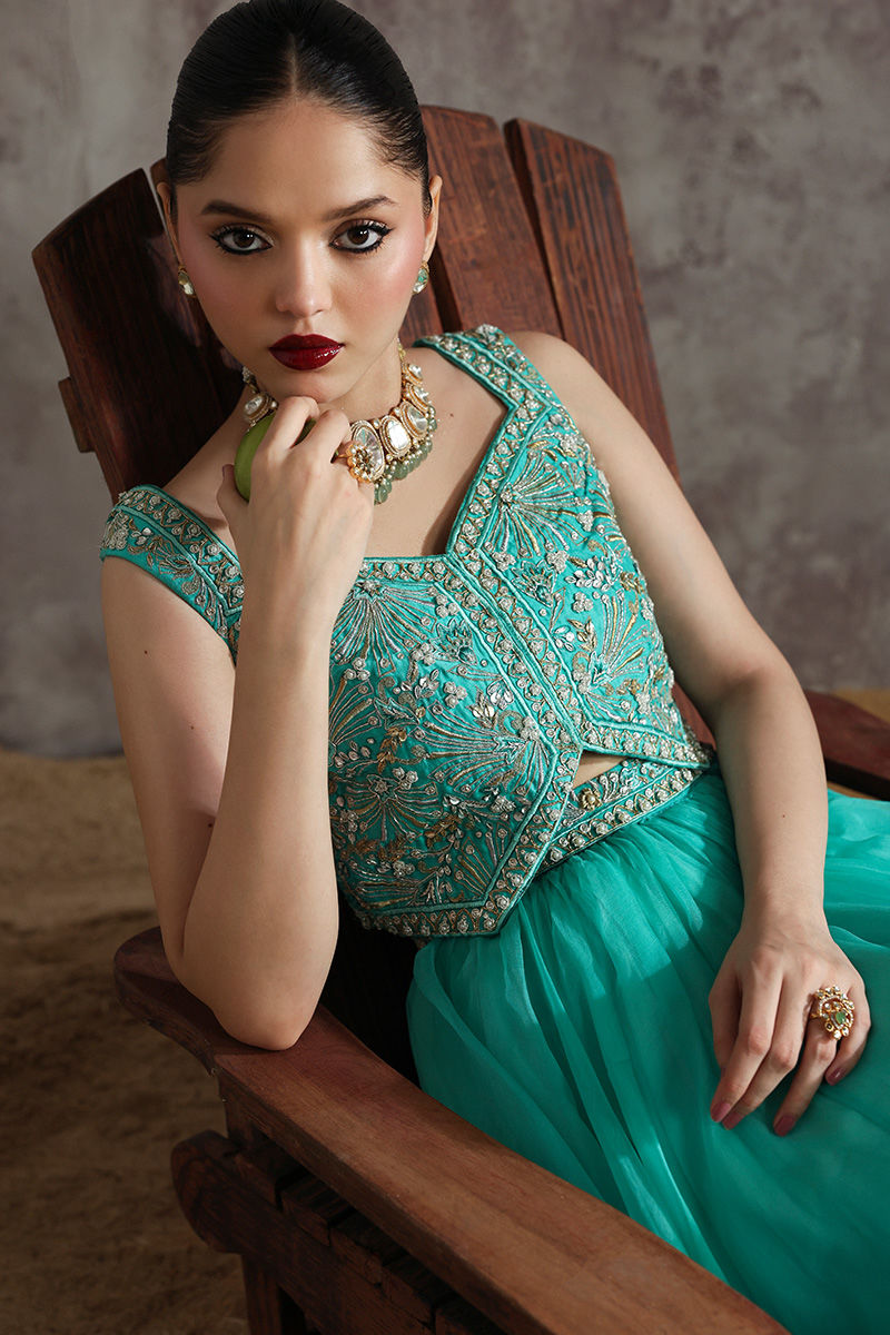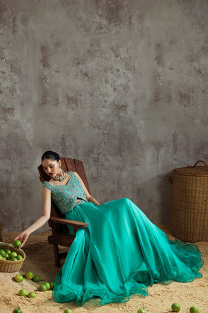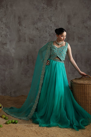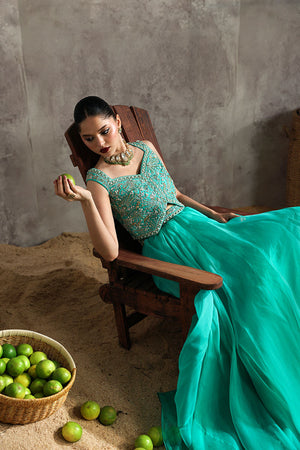 An elegant sea green ensemble featuring a Korean raw silk blouse, paired with a pure organza lehnga and a matching pure organza dupatta. A graceful design that blends luxury with timeless sophistication.