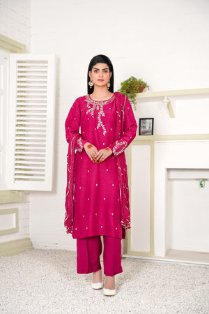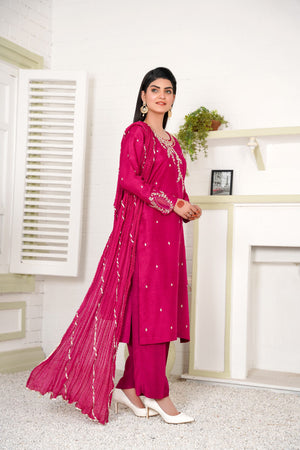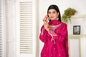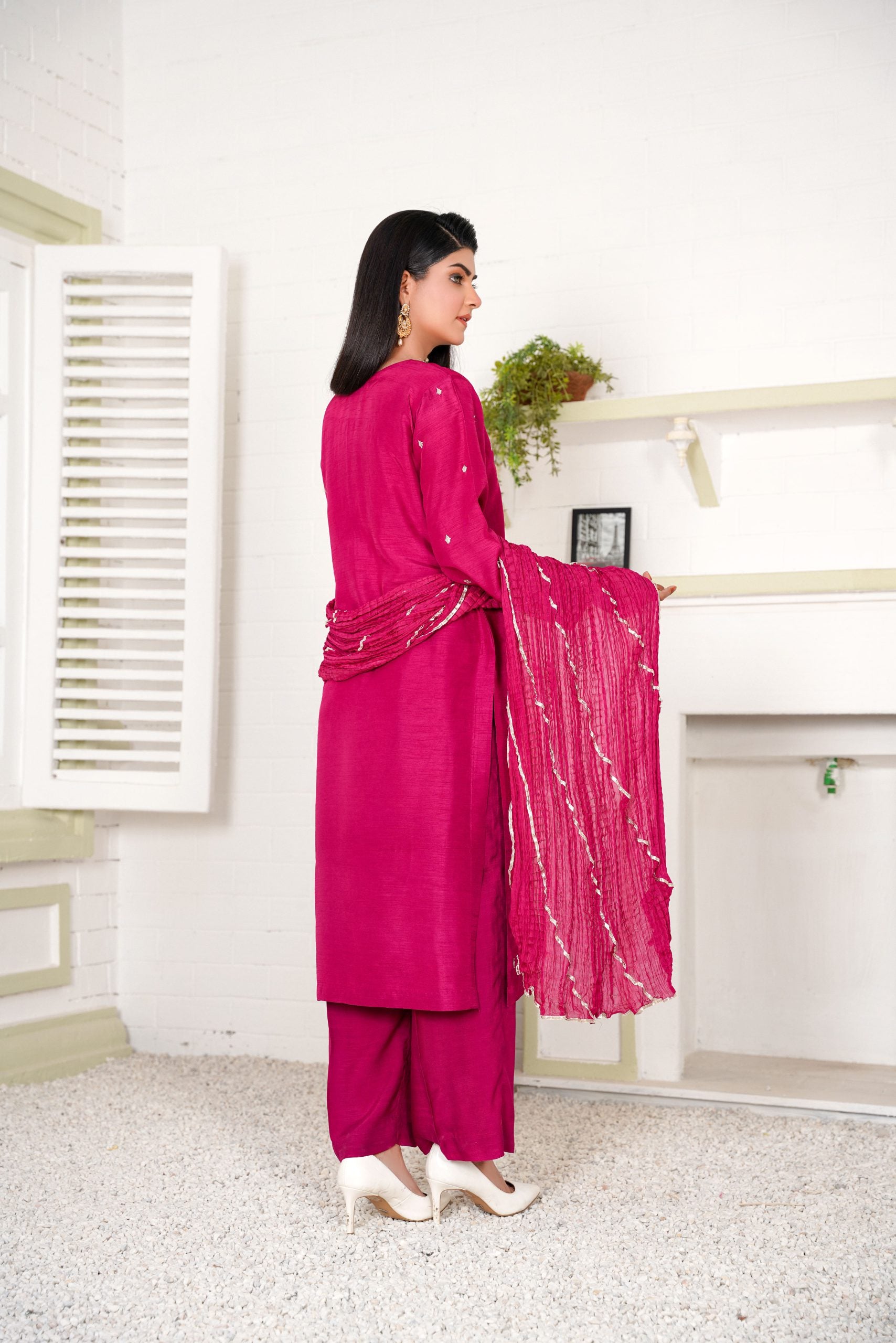 A beautiful magenta color outfit has embelisshed on neckloine and sleeves with gotta work and hand embroidery with stones and swarovski and crushed dupatta with gotta detailing on it. Trousers included.