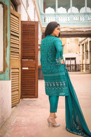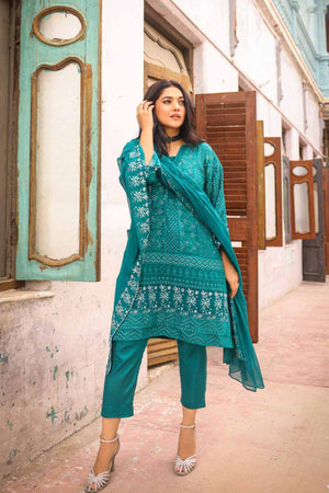 Delicate details; cut from Indian-chiffon. This beautiful shirt is rendered with embroidered Chikan kari - Paired with matching straight pants & embroidered dupatta.Collection: Nissa'21