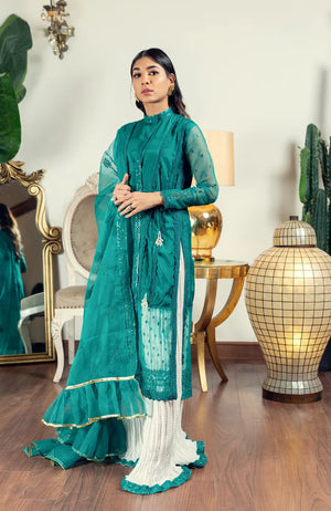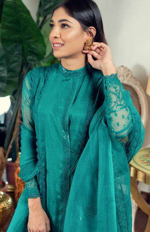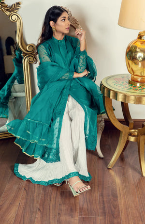 A dramatic, graceful kalidaar in the most dreamy shade of green. Cut from cotton silk, with translucent organza sleeves and daman borders, this figure flattering silhouette is adorned with an array of delicately shimmering pearls and sequins. A organza dupatta, finished with an organza frill, adds a distinctly elegant flair to your final look. Pair your outfit with our crushed Gharara pants and some stunning earrings to stand out at any event.Material : Cotton silk