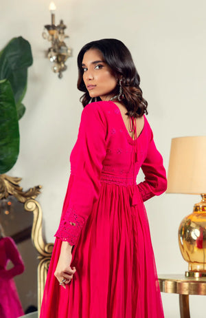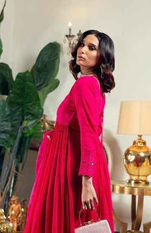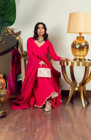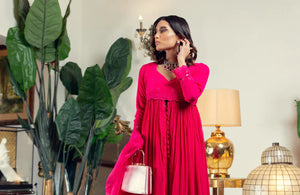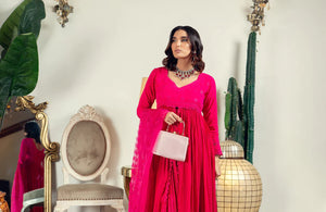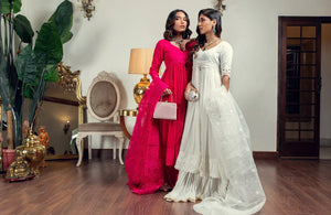 There is nothing that captures AJ's feminine, romantic aesthetic more than a lovely, effortlessly flowing front open Peshwas. Cut from chiffon, this gorgeous ensemble, the perfect solution this Eid or other special occasions is hand encrusted with an array of delicately shimmering sequins and schiffli embroidery on the front and back necklines as well as the sleek, glamourous sleeves paired with an organza cutwork dupatta and crushed Sharara.Material : Chiffon