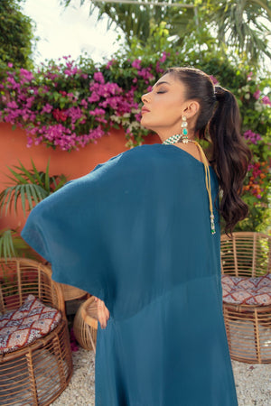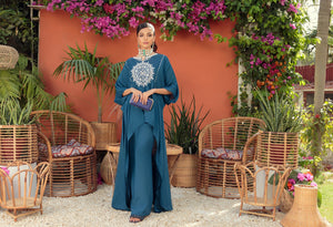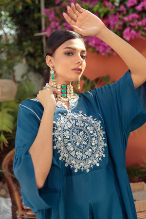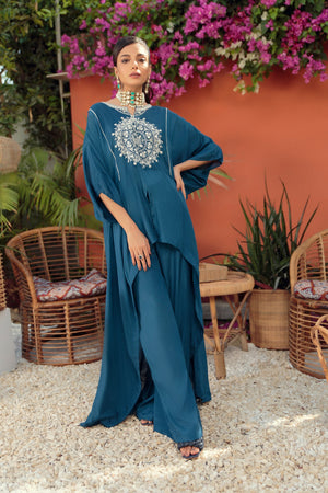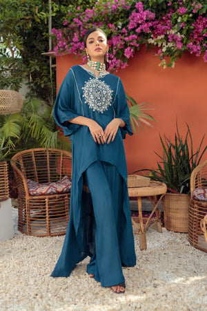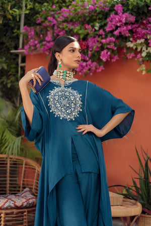 The cut, fabric, and fit of the poncho are always so flattering, as this one demonstrates. The blue cotton silk ensemble is adorned with thread embroidery. It is paired here with a bellbottoms pants