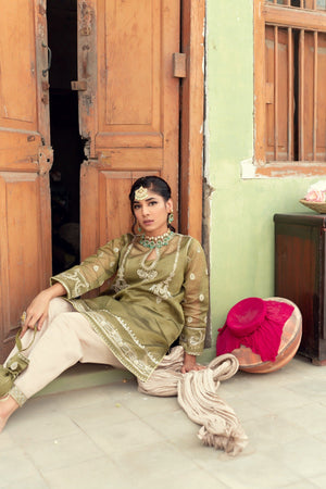 Step out in style this season. A perfect blend of thread embroidery and tilla embroidery on this woven organza silk kurta paired with a straight cut tissue shalwar and a beautiful crushed tissue dupatta.