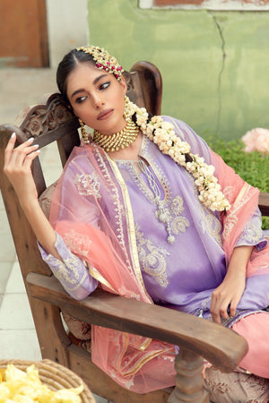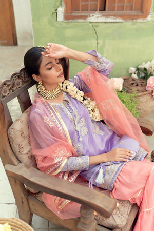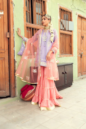 She adorns a tissue straight shirt embellished with delicate and elegant Zari embroidery. The shirt is beautifully paired with a stunning gathered Gharara adorned with gota work. Completing the ensemble is a contrasting net dupatta that adds a touch of beauty to the outfit.
