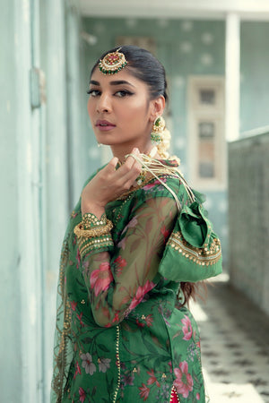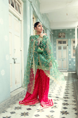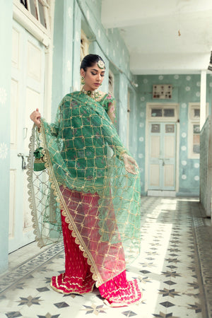spread all over shirt and a detailed neckline. It is paired with a hot pink crushed printed Gharara and a beautiful embroidered net dupatta adds a touch of elegance to the outfit.