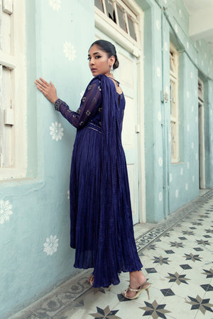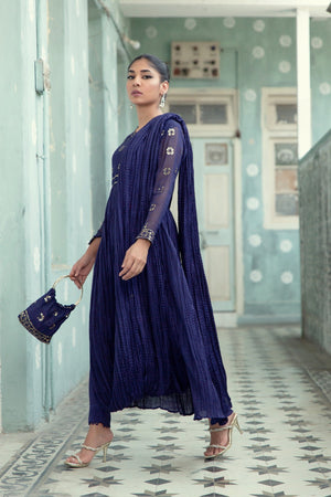 Radiate charm in this enchanting blue coloured crushed cotton silk draped dress. The georgette bodice showcases exquisite sequence work. This dress drapes flawlessly, ensuring you'll captivate attention at any of the season's events.