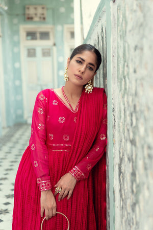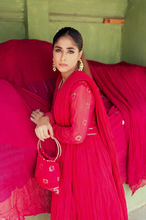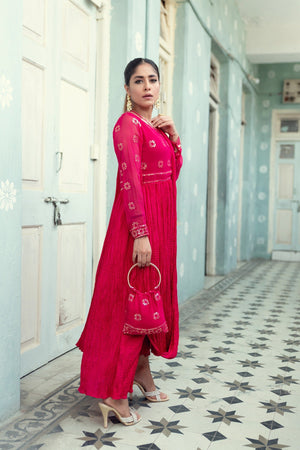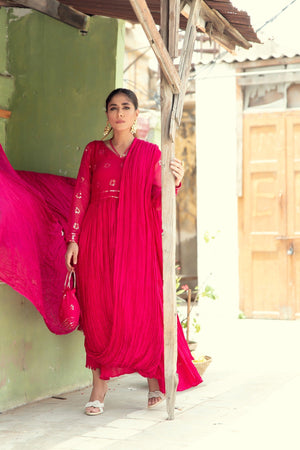 Radiate charm in this enchanting hot pink coloured crushed cotton silk draped dress. The georgette bodice showcases exquisite sequence work. This dress drapes flawlessly, ensuring you'll captivate attention at any of the season's events.