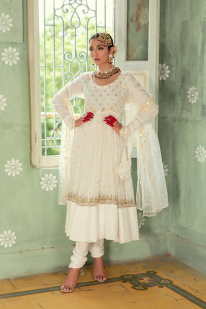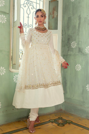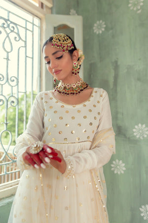 Introducing the exquisite Anum Jung Signature Pishwas, a four-piece ensemble adorned with stunning sequin work. This fully embroidered pishwas set glimmers with the brilliance of sequins and is accompanied by a beautifully embroidered net dupatta. Paired with a churidar pajama, this outfit is perfect for your special wedding day. Don't hesitate! Get yours now before it's sold out.