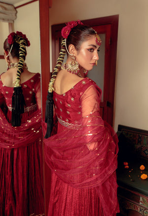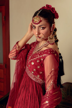 Introducing the highly anticipated AJ Signature collection, a pinnacle in bridal elegance. The star of this collection is the Crushed Peshwas, showcasing a mesmerizing maroon palette and adorned with delicate threadwork and Zari embroidery. The body of the garment is accentuated by subtle sequins, and the damaan features intricate sequence embroidery. To enhance practicality, a convenient pocket has been added for the wearer's ease. This ensemble is perfectly complemented by a crushed sharara and a stunning net dupatta embellished with intricate sequins.