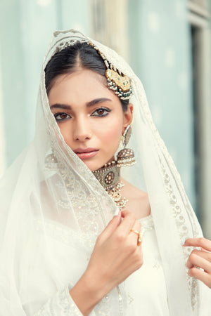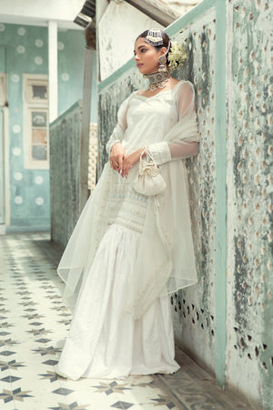 Presented here is an exquisite white suit adorned with enchanting thread and sequins embroidery, complemented by a graceful Nawabi Gharara. The ensemble is elegantly paired with an organza dupatta, and the entire outfit is crafted using Banarsi Cotton Silk fabric.