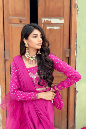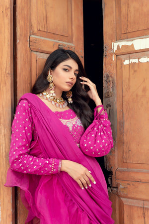 A flowing, floaty dream in the most perfect shade for you to indulge in. This seasons best loved hue cut in the most flattering silhouettes, to make the most effortless style statement. Lastly, paired with a pre-draped dupatta with a dramatic frill for maximum impact.