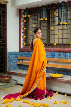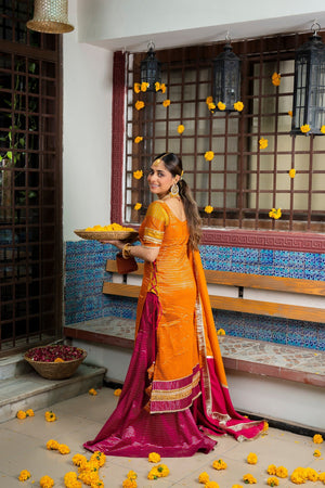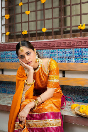 Effortless ensembles that are easy on the eyes. Traditional embrodieries are elevated by regal hues, our straight long shirt featuring Zari embrodiery with sequence work paired with a Gharara and Silk dupatta.
