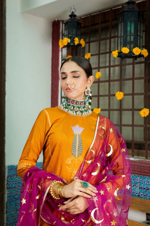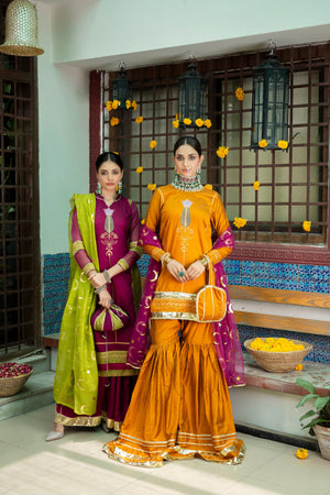 The Gharara set has mesmerising and subtle gota work and is paired with net foil printed dupatta. The outfit is based on Banarsi Cotton Silk.