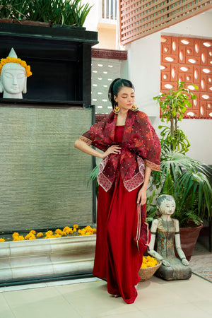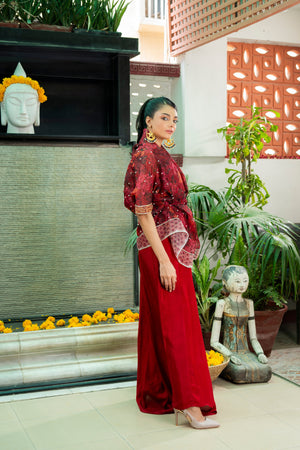 This delightfully detailed piece can easily translate from effortless glam to extravagance. The fit is paired with a padded slip, belt and trousers.