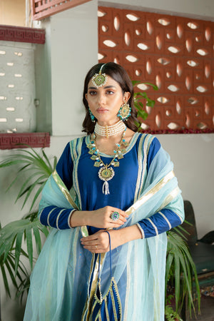 Effortless ensembles that are easy on the eyes. Traditional embrodieries are elevated by regal hues, our straight long two toned shirt featuring Zari embrodiery with sequins paired with a Bellbottom pants and net dupatta with gota.