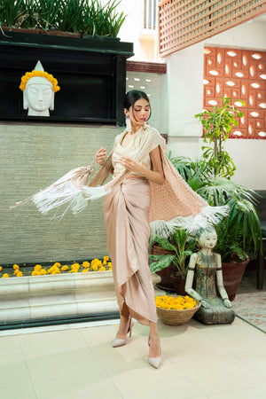 We are in love with this vanilla shade. Understated yet fully worked ( Pearl chain ) silk cape jacket.