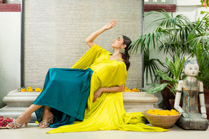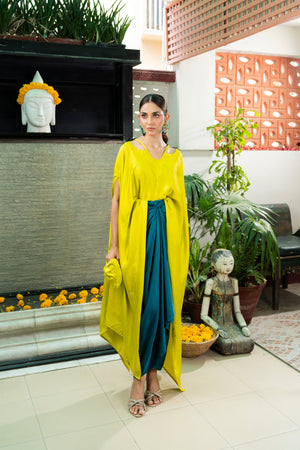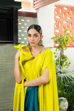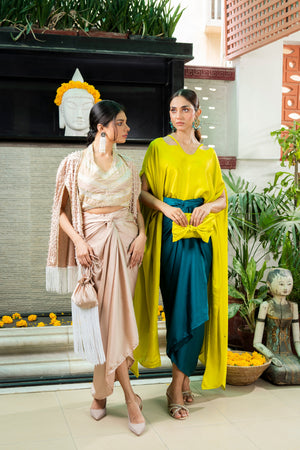 The cape is cut from silk with gorgeous silhouette.This delightfully detailed piece can easily translate from effortless glam to extravagance. The fit is paired with a Chic silk skirt is super chic and cut to perfection making the outfit edgy and elegant.