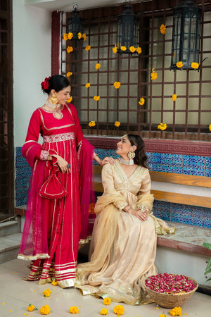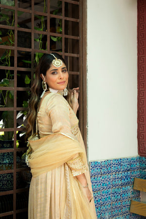 Introducing the highly anticipated AJ Signature collection, a pinnacle in bridal elegance. The star of this collection is the Peshwas, showcasing a mesmerizing golden palette and adorned with delicate threadwork and Zari embroidery. The body of the garment is accentuated by subtle sequins, and the damaan features intricate sequence embroidery.