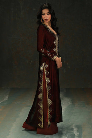 Crafted in deep burnt-garnet velvet, this silhouette is adorned with geometric gota handwork that catches the light like glowing embers at dusk. Paired with a firey block print organza dupata the look blends tradition and modern finesse. Comes with wide legged Korean silk pants.