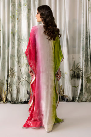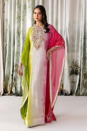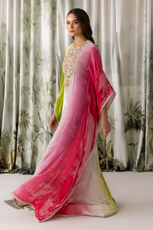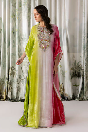 The ombre cotton candy effect long kaftan in pure velvet simply radiates glamour. It has indicated hand work on neckline.