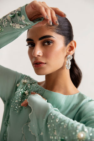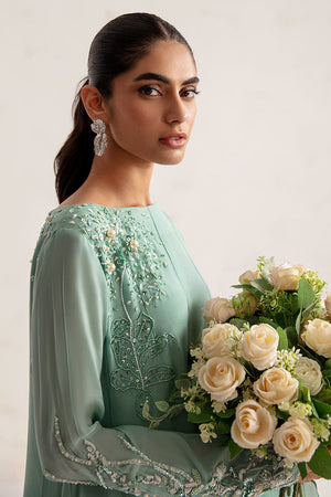 The Flattering silhouette is showcased in this garment, crafted from a soft and flowing grip fabric. It is beautifully adorned with intricate botanical zari work on the neckline and sleeves. The unique design features one sleeve with a slim-fit cut for a sleek look. While the other sleeve boasts a graceful cape silhouette, further enhanced by scalloped detailing along its entire length, creating a captivating appearance.