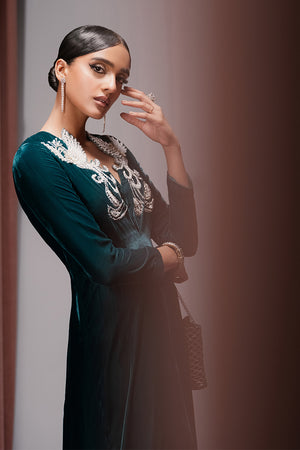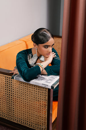 This luxurious bottle green velvet kaftan dress, adorned with intricate dabka, beads, pearls, sequins, and Swarovski crystals, brings a whole new level of glam. The floor-length kaftan with side slits, box pleats, and a scalloped neckline make this piece an absolute showstopper. Complete the look with plain silk dupatta for that perfect touch of grace.