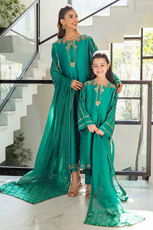 Introducing an exquisite emerald green ensemble crafted from luxurious pure sheesha silk for both the shirt and pants, paired with a stunning paper cotton Banarsi dupatta featuring pure embroidered organza borders. This dress is a masterpiece of intricate embellishments, with handworked sequins, kora, dabka, naqshi, crystals, stones, and pearls adorning both the neckline and hem, creating beautifully detailed front and back designs. The sleeves showcase elegant pleats and a delicate line of sparkling stones, adding an extra layer of glamour to this sophisticated piece.