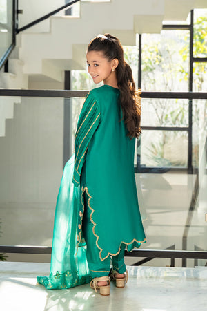 This exquisite emerald green ensemble is crafted from luxurious pure sheesha silk for the shirt and pants, paired with a stunning paper cotton Banarsi dupatta featuring pure embroidered organza borders.