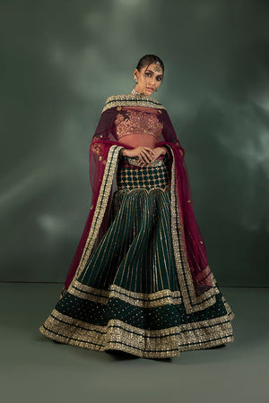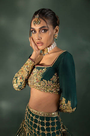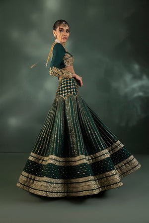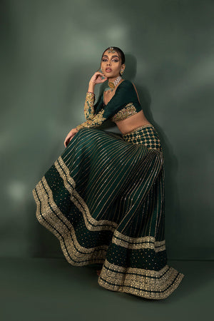 Introducing the ''Emerald Majesty'' - the ultimate luxury party wear for the fashion-forward. This exquisite set includes a beautifully-crafted lehenga, choli, and dupatta, all designed with superior quality materials for a luxurious experience. Make a statement with ''Emerald Majesty'' and elevate your style game